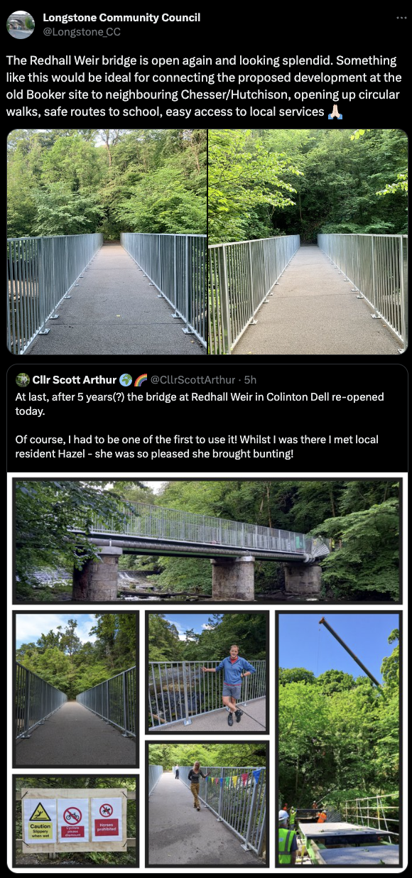 🏞 Five years after closing for refurbishment, Redhall Weir bridge in Colinton Dell re-opened yesterday.